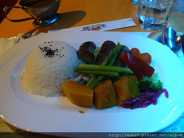 我的健康蔬菜咖哩↓蔬菜有分水煮跟炸的 ~我點水煮。咖哩有點小辣~~不過醬跟飯可吃到飽,適合很會吃飯的人。
